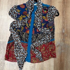 This vibrant women's top features a mix of bold patterns and colors, perfect for making a statement. The multicolor sheer design includes shades of blue, red, and black, offering a unique and stylish look & a fun leopard attached bow/scart