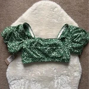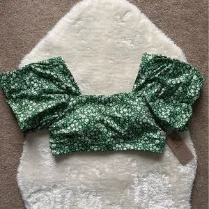 Stylish green floral bikini top with a square neckline and puff sleeves that can be worn on or off-the-shoulder. Sleeves have a grippy lining to stay in place. Removable bra cups. Perfect for a chic beach look. Brand new with tags.