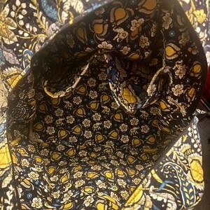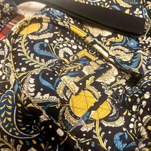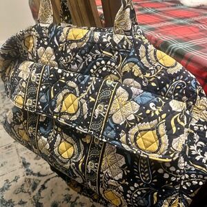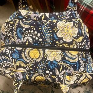 A vibrant Vera Bradley quilted duffle bag adorned with a captivating blue and yellow paisley print. This versatile bag features comfortable shoulder straps and a detachable crossbody strap for flexible carrying options. The quilted exterior offers a soft texture and durability. Inside and outside, multiple pockets help organize your essentials. A zippered top closure secures the main compartment.