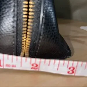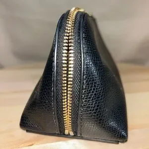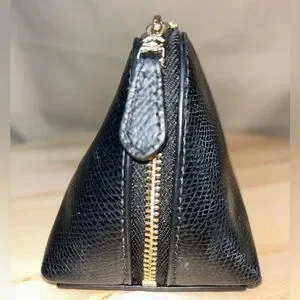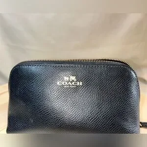 Elegant Coach toiletry bag in pebbled black leather. Ideal for travel essentials. Purchased by me at Coach store. Gold Hardware, w/o tarnish. Wide zipper opening w/ gusset (keep items in place), black satin lining, one slot for smaller items. Perfect for versatile use, cosmetics or personal items on the go. See photos for measurements. No marks, scratches or ink marks. Item picture is item sold, w/o paper tags or cards. Smoke free home. Tape dispenser not included 😊