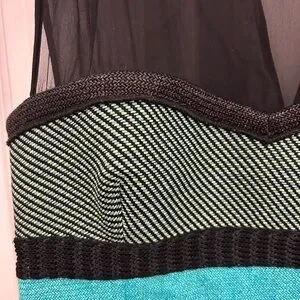 Structured dress with gorgeous knit fabric in teal. Bust has a black, teal and aqua pattern and top features a black mesh that buttons at back. Dress has side zipper. Dry clean only. Made in Italy. 16” across bust/pit to pit, 15” under bust (black band), 15.5” at natural waist, 19” ag widest part across hips. Dress has some stretch, but is a structured fabric. Amazing used condition. Want a designer dress to wear to a wedding? Skip Rent the Runway and OWN a designer dress for the same price!