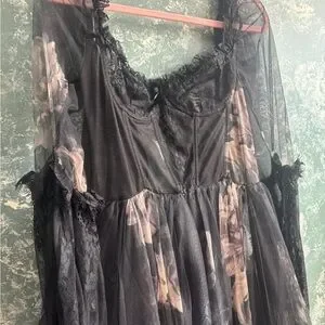 Stunning black gown with floral patterns. Features delicate lace details.