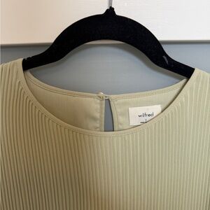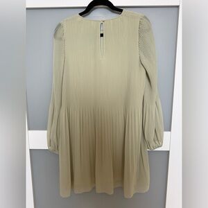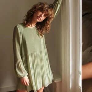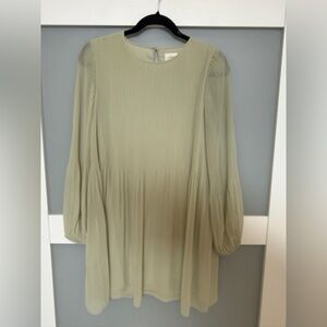Whimsical and darling long sleeve pleated chiffon mini dress in light sage green by Wilfred. Soft pleats and babydoll sweetness.