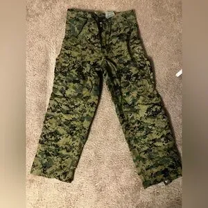 Durable GORE-TEX cargo pants with a green camouflage pattern. Ideal for outdoor activities.