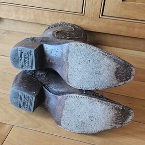 Photos really dont do these boots justice, they are absolutely gorgeous! Brass rivets with dark orange stones and leather detailing make these boots stand out wherever you go! Ive only had them for 2 or 3 years, but a little recent weight gain means they just dont fit me anymore. My loss is your gain, don't miss out on these boots.