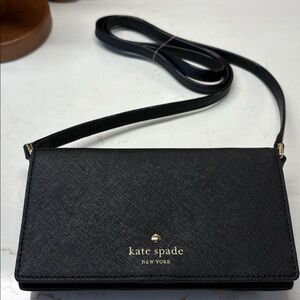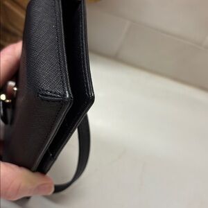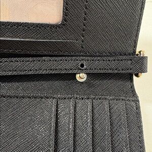 Great crossbody wallet with ID window, 6 card slots and Space for cash, receipts, etc. outside snap pocket on back. Removable strap by way of taking it off little gold buttons as seen in pictures. Cute grab and go item with hands free if need be.