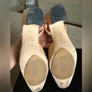 Chanel black/beige slingbacks. Size 38.5. I am a US 8 and these fit perfectly. Excellent condition as you can see in the pictures. Wore 2-3 times for a few hours. They come with a shoe protection sole because I do these to all my shoes so they can last longer and also for better traction. Bought from the Chanel store in Houston.