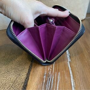 This wallet remains in excellent condition with a clean, odor‑free interior and exterior. Very light wear on the leather and subtle hardware scratches are noted for transparency. The interior is like new, with only a few small indents where the zipper rested against the card slots. Corners, edges, and structure are in pristine shape, preserving the wallet’s overall exceptional appearance.