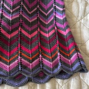 Charming chevron knit dress with pink, purple and gray tones. Soft and stylish design. scallop detail at hem and sleeves.