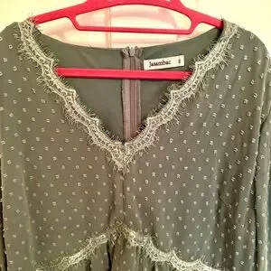 【FEATURES】Deep V neck, Swiss dot, dainty eyelash lace, elasticized darted bodice, long sleeves, mini dress, pleated, inside liner, loose fit, breathable material, A-line dress, zipper closure
