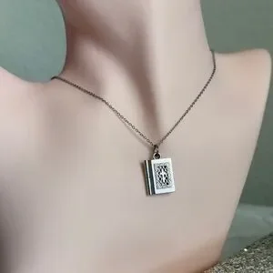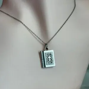 Elegant silver book pendant on a delicate chain. Intricate design adds charm.