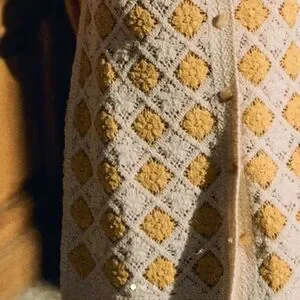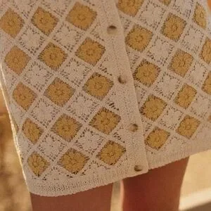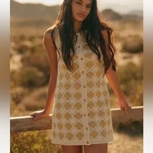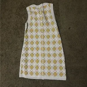 Elegant crochet dress with diamond pattern. Features cream and yellow tones. Ideal for casual wear.