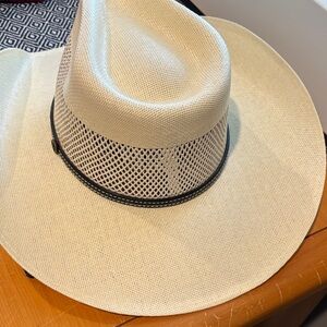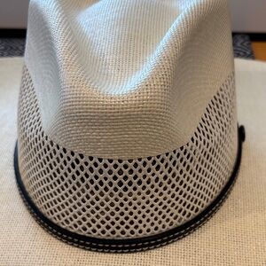 This chic cream cowboy hat features a sleek black trim, perfect for elevating your style. Ideal for any occasion.