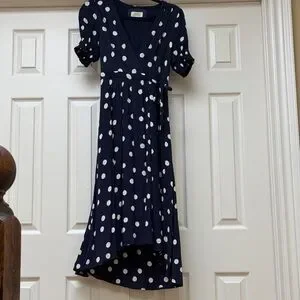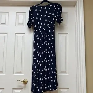 Features a flattering wrap design and polkadot print which is on trend for spring g 2026! Ideal for any occasion. Fits sizes 0-2. Love this dress and on the fence about selling.