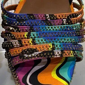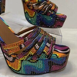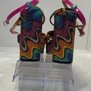 Bold multicolor heels with vibrant straps. Chunky platform design. Perfect for standout style. Please note a defect, shoes are missing ankle straps