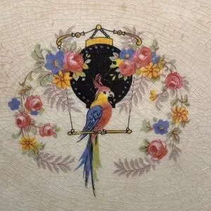 An interesting platter featuring a colorful parrot on a swing. The colors of flowers, greenery, the parrot and the swing seem bright on the platter. The blue ring painted in approximately 1.5 inches from the edge shows some irregularity.