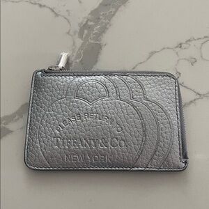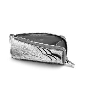 Chic metallic wallet by Tiffany & Co. Features embossed logo and zip-around design.
