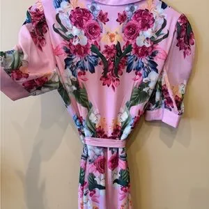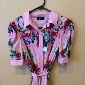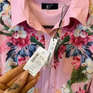 Chic pink blouse with vibrant floral design. Features a classic collar and button-down front.