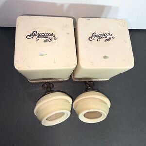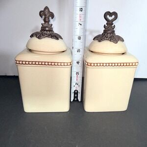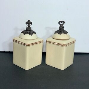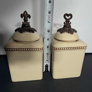 Set of 2 8" hope and love Square ceramic canister set features a cream-colored crackle glaze finish with elegant beaded trim around the shoulder. Each jar is topped with a decorative lid featuring a rustic, dark bronze-toned metal finial—one in a fleur-de-lis design and the other a heart shape. The weighted metal lids sit atop rounded ceramic bases, creating a sophisticated French Country or farmhouse aesthetic perfect for kitchen storage or vanity decor.