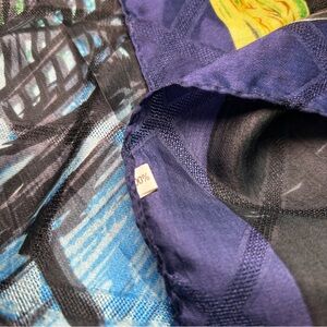 silk scarf abstract, colorful silk square scarf, blue green orange scarf, starry night art scarf, street art silk wrap, 100% silk accessory, women’s silk neck scarf, vintage style silk scarf, blue border silk scarf, artistic print scarf, square scarf