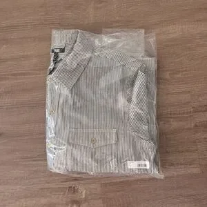 "This long sleeve button down is made from 100% cotton, offering both comfort and structure. The Renzi shirt features a classic railroad stripe pattern in ecru with indigo stripes, complete with double chest pockets and refined horn buttons."