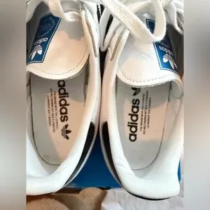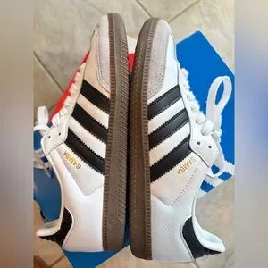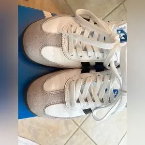 White Adidas Samba shoes featuring black stripes and gold lettering. Iconic style with a brown sole. Men’s 7 1/2 women’s 8 1/2 shoes . A unisex shoe. Some creasing but usual with this style shoe. Price reflects.