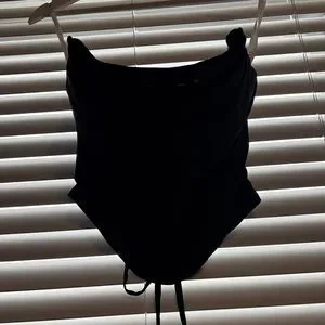Stunning black strapless 3-piece corset set (corset, skirt, scarf). Perfect for weddings. Elegant and timeless design.
