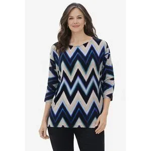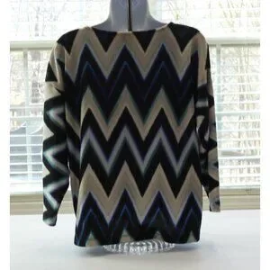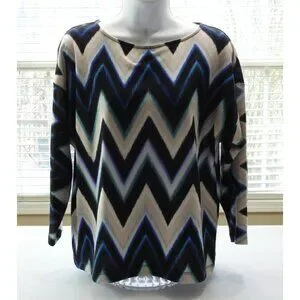 Bold and flattering Chico’s chevron print top in a stunning mix of navy, cobalt, aqua, black, and soft beige. This stretchy knit blouse has an easy, comfortable fit with a classic boat neckline and 3/4 sleeves. The zig zag pattern gives it a slimming, elongating look that pairs perfectly with jeans, black pants, or white denim.