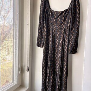 The Sigmund in black/gold Linguini is slim fitting in the bodice with a relaxed fitting skirt. It has lightly puffed shoulders and a high slit. This dress gives you a structured yet comfortable look. Slim fitting in the bodice with a relaxed fitting skirt. Worn once.