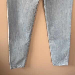 Inspired by 80s/90s styles. Extreme high rise. Slouchy, tapered leg silhouette. Light blue wash, intentionally faded/whiskered. Relaxed, tapered fit that is comfortable ye stylishly retro. Length designed to “puddle” at the hem.