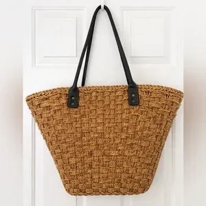 J.Crew Woven Seagrass Tote | Black Leather Handles | Large Beach Vacation Bag