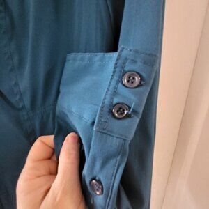 Elevate your professional wardrobe with this classic and flattering button-down from San Francisco (Québecboutique). This blouse features a beautiful deep teal/slate blue color that transitions perfectly from the office to dinner.