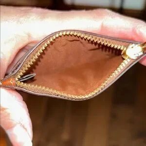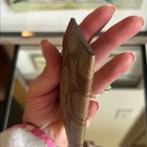 Elegant Coach card holder in tan and brown. Features a colorful logo design. Ideal for keeping essentials organized.