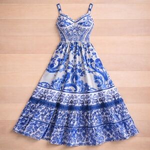 Charming maxi dress with intricate blue floral design. Sleeveless with a fitted bodice. Flowy and elegant for any event.