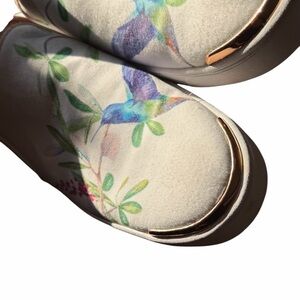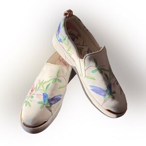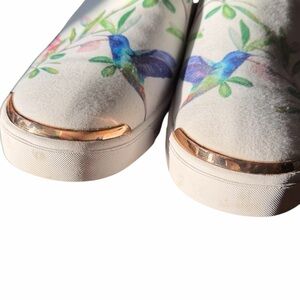 Elegant slip-on Ted Baker Women's Tancey sneakers with a hummingbird design. Features cream canvas with vibrant accents. Perfect for casual wear.