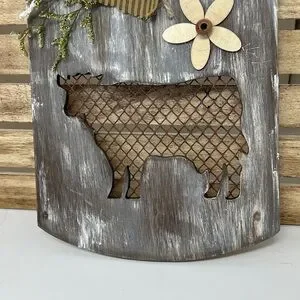 Charming rustic wall decor featuring a cow cutout. Hand Crafted and Adorned with a striped bow and floral accents. Perfect for adding a farmhouse touch.