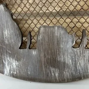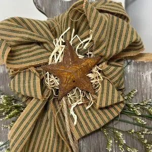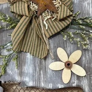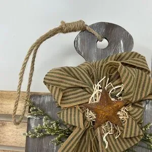 Details: Brown Distressed Wood with chicken wire cow cutout country striped bow with rusty star jute rope hanger