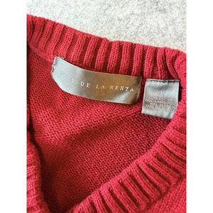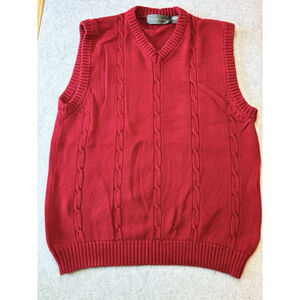 The product is a vintage 90's Oscar de la Renta cable knit burgundy sweater vest made of cotton in size XL. This stylish vest features a classic cable knit design and a bold red color, perfect for adding a pop of color to any outfit. With a retro 90s theme, this sweater vest is sure to make a statement and is a timeless addition to any man's wardrobe. Preppy and Grandpa Core and very “Old Money” vibes