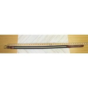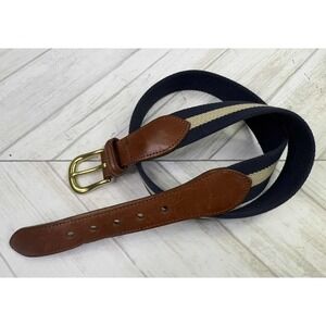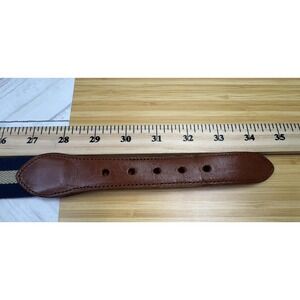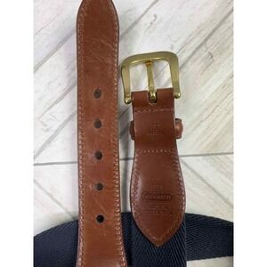The Coach Leather Twill Belt is a classic and preppy accessory for men, featuring a navy blue and beige stripe design. Made from twill and leather, this vintage-style belt is adorned with a brass buckle and is 32 inches in size with an approximate 1-inch width. Perfect for both work and dressy occasions, this designer belt exudes a timeless and sophisticated look, making it a versatile addition to any wardrobe. Crafted in Costa Rica, this belt showcases quality craftsmanship and attention to detail, embodying the brand's reputation for excellence in men's accessories.