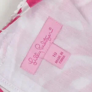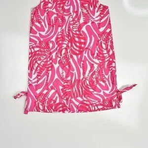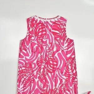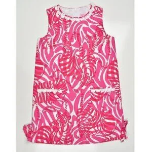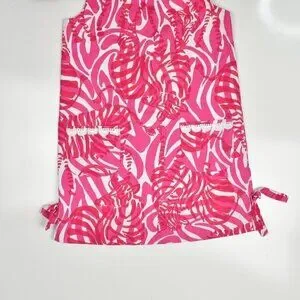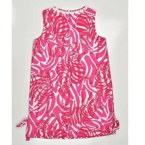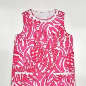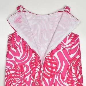 Lilly Pulitzer zebra print shift dress. Size 10. Pink and white. Back zipper. Side hem slits with decorative ties. Fully lined. Crochet trim at neck and front pockets.