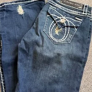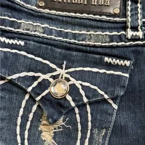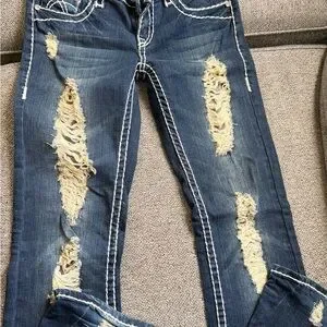 Chic distressed denim with bold stitching. Ideal for a casual look.