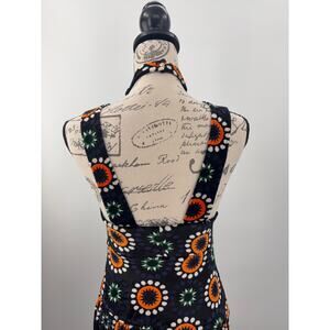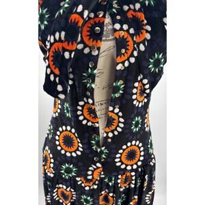 Make a sophisticated statement with a silhouette that marries 70s-inspired maximalism with contemporary edge. Crafted from plush, high-sheen velvet, this midi dress features a striking "sun-burst" medallion motif in earthy ochre, forest green, and crisp ivory set against a deep obsidian base. Has slit.