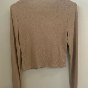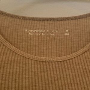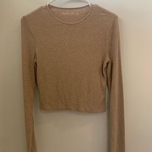 This cream tan -colored crop top from Abercrombie & Fitch features a fitted silhouette and long sleeves, offering a chic and minimalist style. Its soft fabric and crew neckline make it a versatile addition to any wardrobe, perfect for layering or wearing on its own.