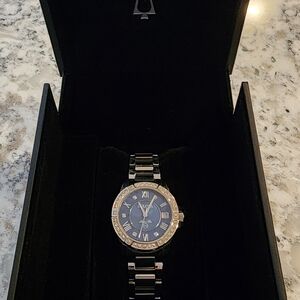 Bulova Women's Marine Star Diamond Watch features a stainless steel bracelet and a blue mother-of-pearl dial framed by a diamond-encrusted bezel!