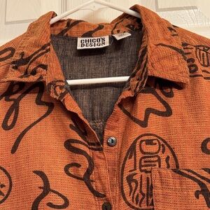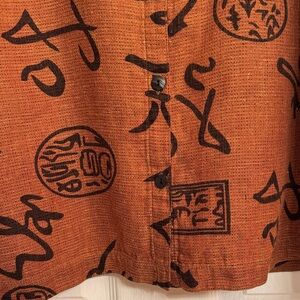 Chico’s women’s brown orange black ethnic button down shirt. Can also be worn as a jacket (shacket). Sleeves can be cuffed with button on sleeve. Perfect for casual outings, it combines comfort with a unique design. Ideal for those who love a statement piece. chinese words and letters.