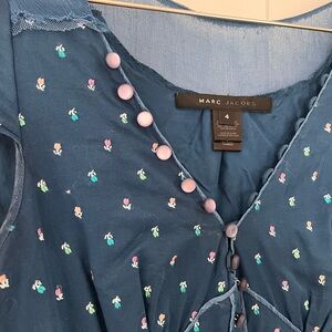 Marc Jacobs 100% Silk Blue Floral Mini Dress Sheer Trim Button Detail Size 4