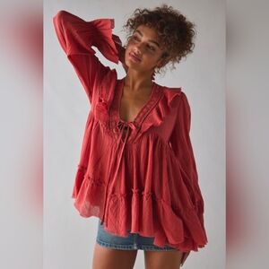 Kimchi Blue Lace Trim Ruffled Babydoll Tunic Blouse Rust Red