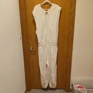 Stylish cream jumpsuit. Sleeveless design. Drawstring waist for comfort. Perfect for casual wear.