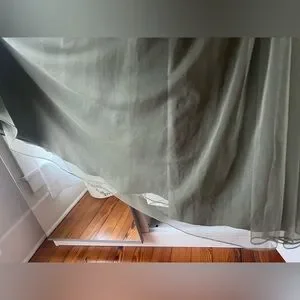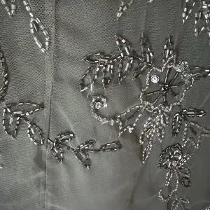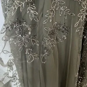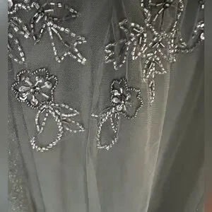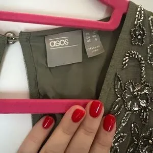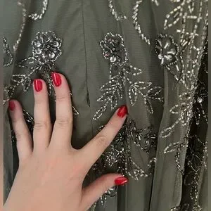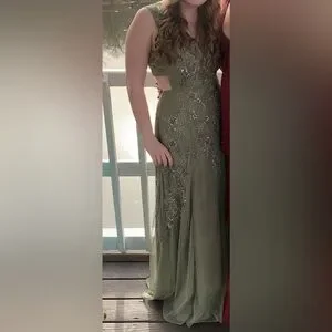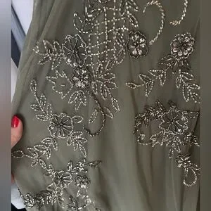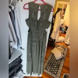 This olive green beaded dress from ASOS design has sequins and beading on the front and back. It also features side cut outs. It has a tulle overlay and a super comfortable lining. The dress is in great condition with only a few loose beads here or there, it’s really impossible to notice when the dress is on. The section with the most loose beads is the back where you sit, and even that looks great. Please note that there are a few loose threads at the bottom of the zipper and a small hole where the zipper poked through. It’s really not noticeable. I wore this dress only once to prom, and it’s been sitting in my closet ever since. I didn’t alter it at all so it’s a true size 8 US from ASOS. Would be a great wedding guest or prom dress.