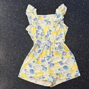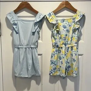 Adorable rompers by btween. Features a light blue solid (small stains on rear right side leg). and a floral pattern with blue and yellow. Black all in motion skirt with built in shorts included. Ideal for fun outings. Our daughter may have worn 2 or 3 times.